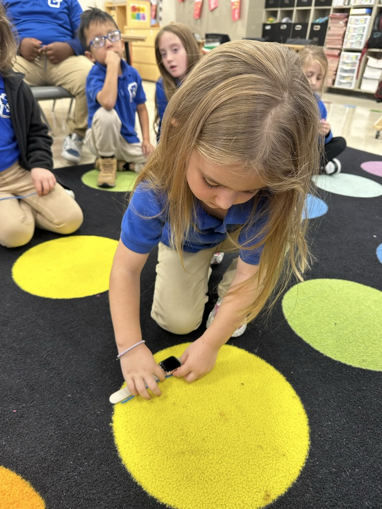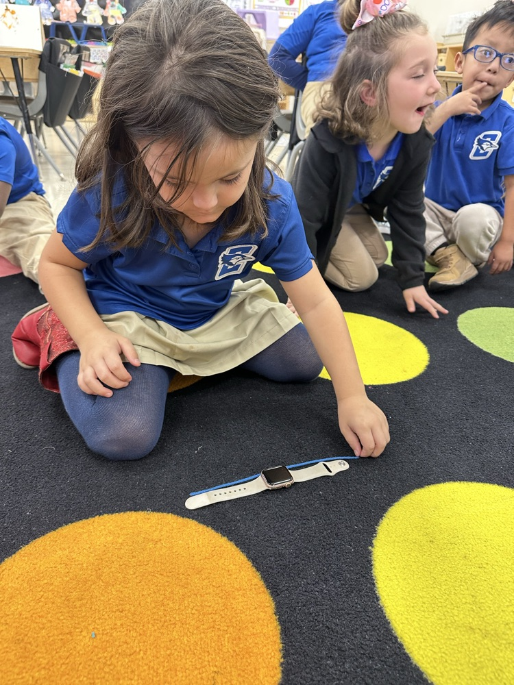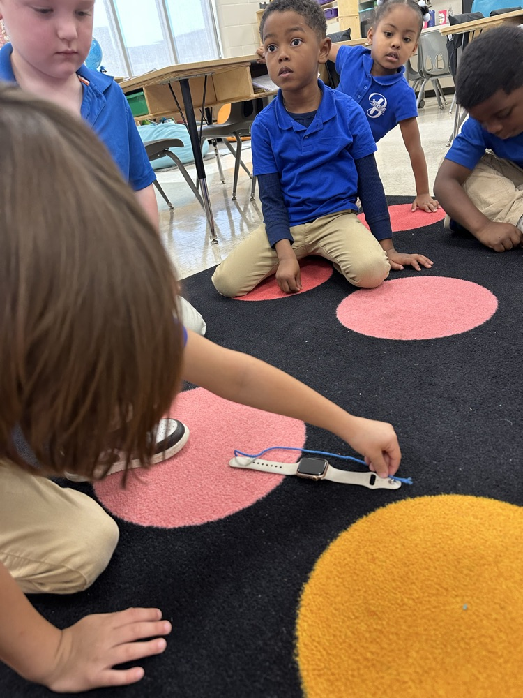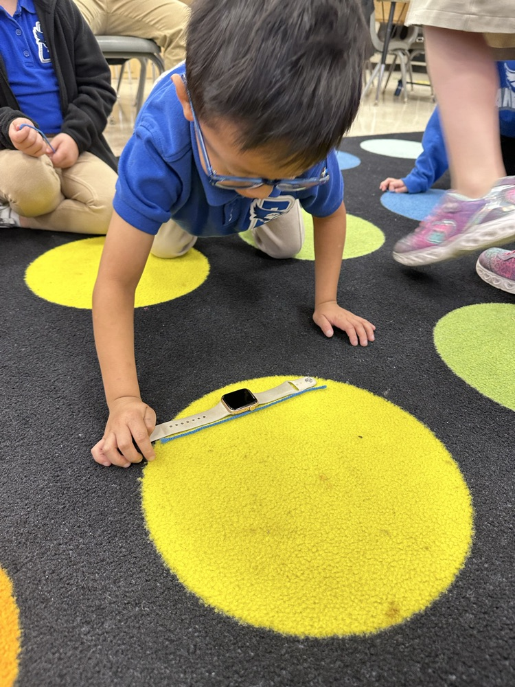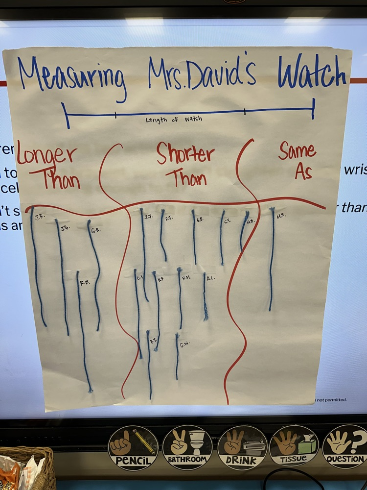 Mrs. David and Ms. Addie’s friends explored measurement today! They estimated how long a piece of yarn would need to be to match the length of a watch, then compared to see if their yarn was longer than, shorter than, or the same as. We even had some extra fun measuring each other!